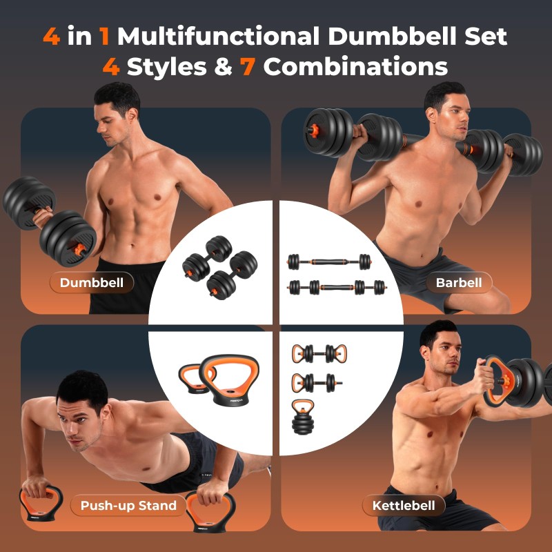 • 【4 in 1 Multifunctional Dumbbell Set】With it, you can get a pair of dumbbells also barbells, kettlebells, and push-up stands. Meet your needs for diversified weight training, including bench presses, squats, push-ups, etc.
