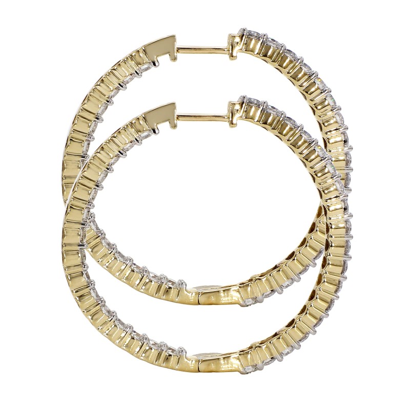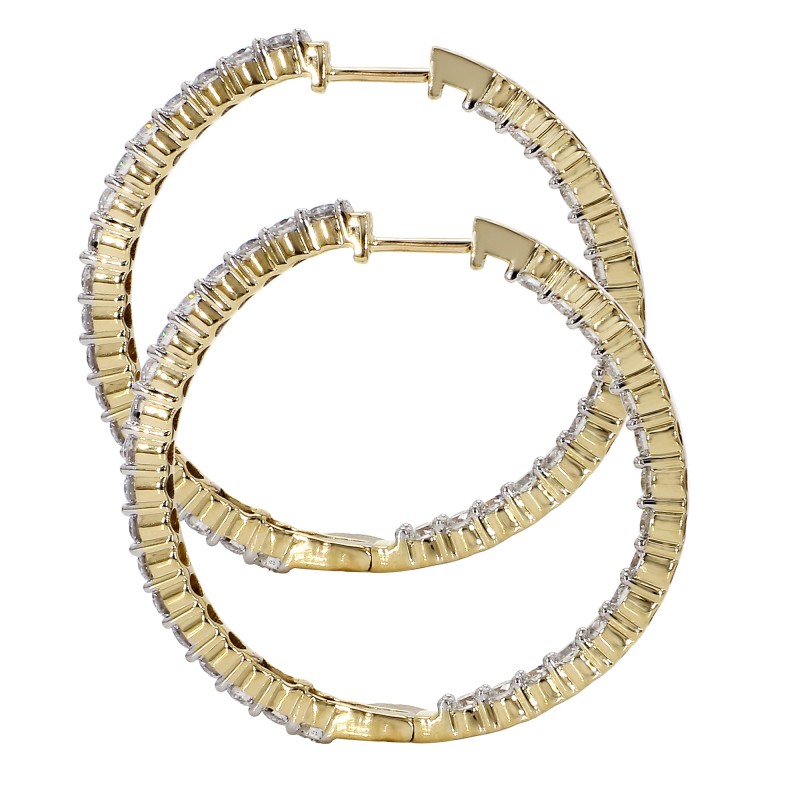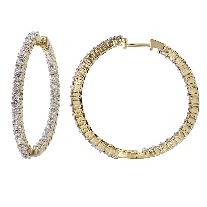 Simple and classic lab grown diamond hoop earrings are charming. These brilliant round cut lab grown diamonds have a F-G color and VS-SI clarity, prong set inside out. These 14K white or yellow gold hoop earrings are extremely versatile and can fit into any wardrobe and complement any occasion.
