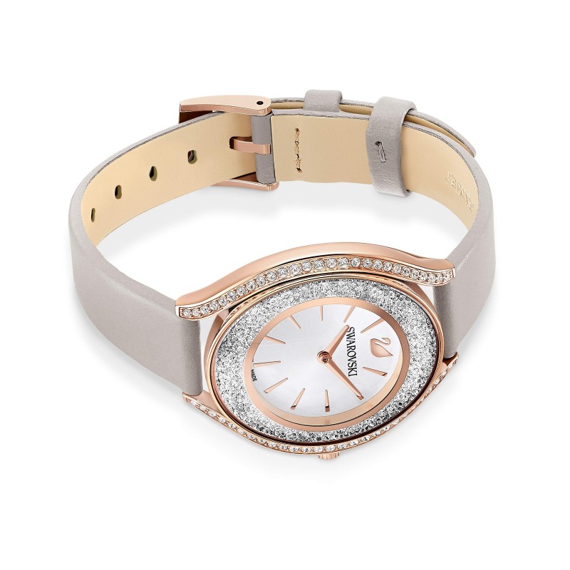 • Items delivered: 1 x Swarovski Crystalline Aura watch, 7 1/2 inch taupe genuine leather strap, 1 3/8 inch crystal accented PVD case and white silver tone dial, with Swarovski watch box