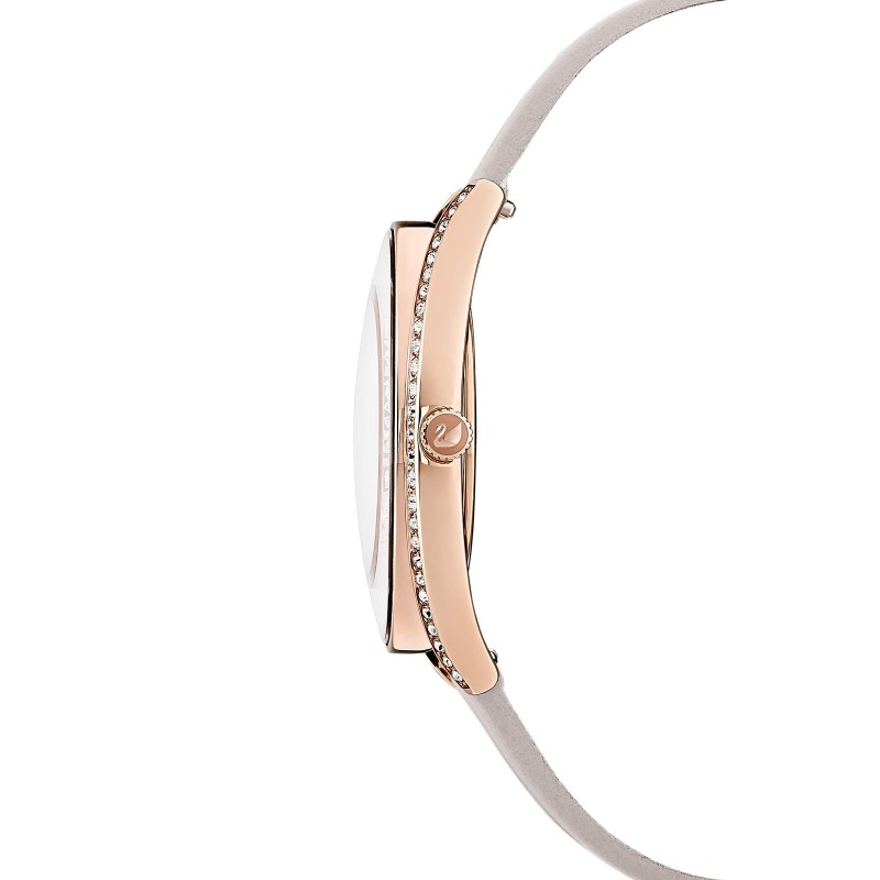 • Eminently elegant: This watch combines the precision and quality of more than 1300 Swarovski crystals with a sparkling white silver tone dial, rose-gold tone PVD case and taupe genuine leather strap
